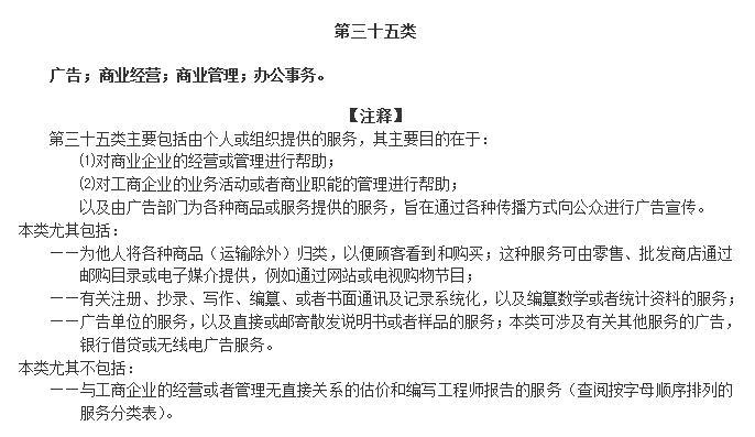 首先,我們先看看《類似商品和服務(wù)區(qū)分表――基于尼斯分類》對于35類的注釋: