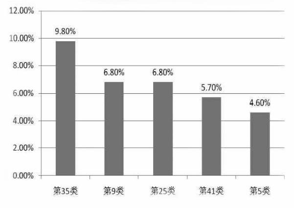 ??從2014年全球商標(biāo)申請來看,服務(wù)類別上的商標(biāo)申請量占所有類別申請量的35.4%。自2004年以來,商標(biāo)注冊用商品和服務(wù)分類(尼斯分類)第35類服務(wù)(主要是廣告、商業(yè)經(jīng)營、商業(yè)管理、辦公事務(wù)等)一直是商標(biāo)申請指定最多的類別,2014年該類別的商標(biāo)申請量占了9.8%。申請量位列第二和第三的類別分別是第9類(科技、聲學(xué)、計(jì)量設(shè)備、錄音設(shè)備、電腦和軟件)和第25類(衣服、運(yùn)動鞋、頭盔),各占6.8%。