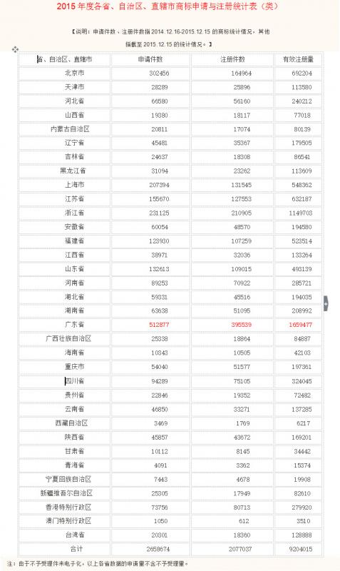 2015年度各省、自治區(qū)、直轄市商標(biāo)申請(qǐng)與注冊(cè)統(tǒng)計(jì)表(類(lèi))