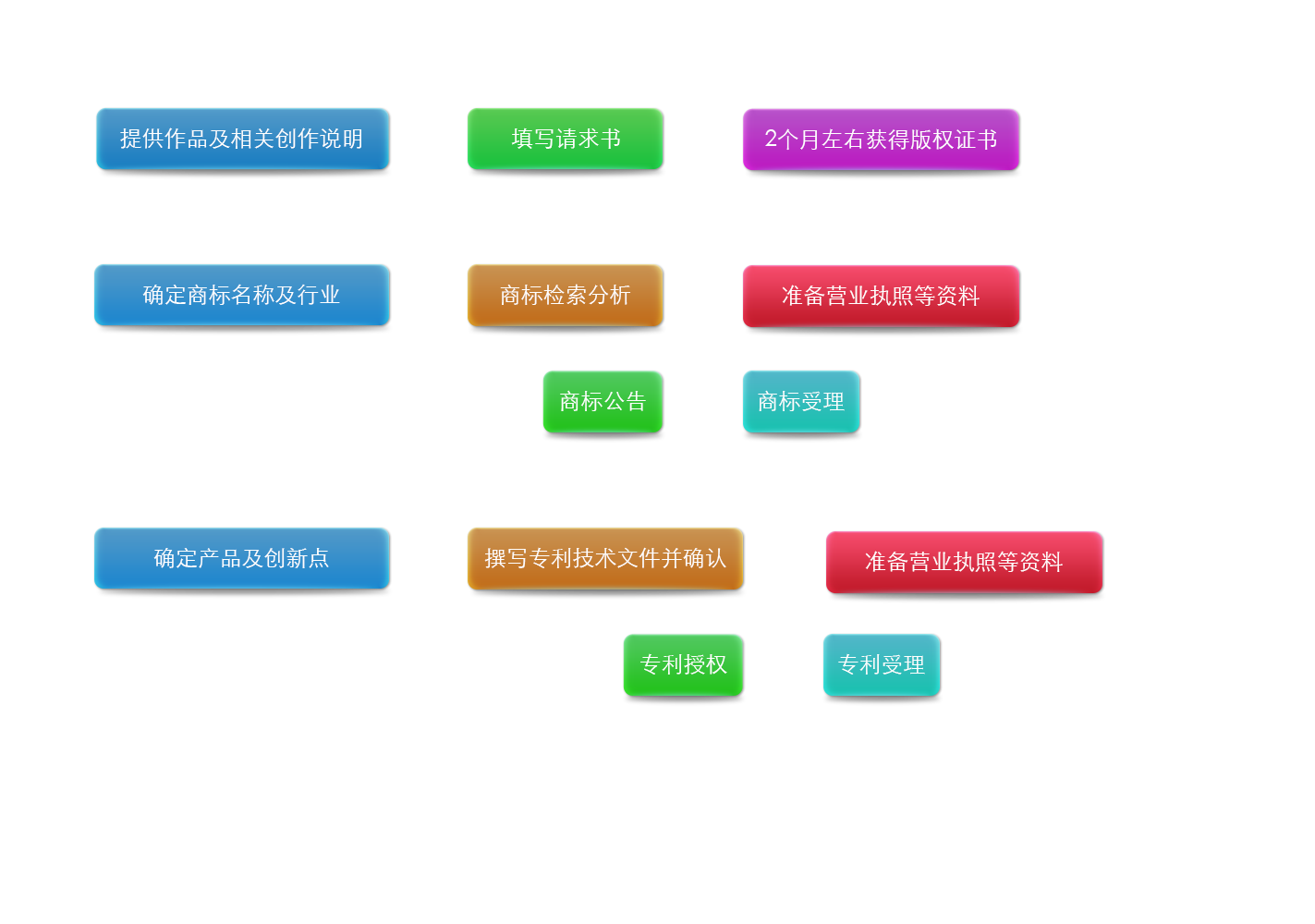 1.營(yíng)業(yè)執(zhí)照(副本)復(fù)印件一張(要求執(zhí)照號(hào)清晰); 2.所要注冊(cè)商標(biāo)的商標(biāo)圖樣一份(大小為5-10厘米,最好為名片大小); (1)如商標(biāo)圖樣為彩色,需提供彩色圖樣11份及黑白墨稿2份; (2)如商標(biāo)圖樣為黑白,需提供黑白墨稿12份; 3.簽定合同,蓋公章